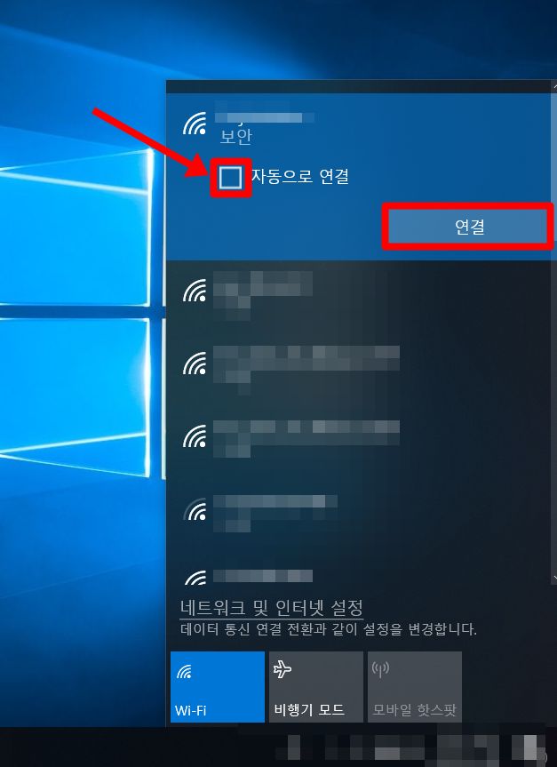 현재 신호가 잡히는 모든 와이파이 목록이 보여집니다. 여기에서 내가 사용하고 싶은 신호를 클릭하시고 연결을 누르시면 되는데 이때 자동으로 연결을 체크하시길 바랍니다. 이제 앞으로 설정한 와이파이가 잡히기만 하면 이런 설정을 하지 않아도 자동으로 인터넷 연결을 해줍니다.