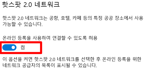 바로 핫스팟 2.0 네트워크입니다. 이것이 무엇이냐면 공항, 호텔, 카페와 같은 공공장소에서 제공되는 신호들을 내가 이용할 수 있게 해주는 것입니다. 집 인터넷이 아닌경우 윈도우10 와이파이 연결을 원활하게 이용하기 위해서 반드시 켜주셔야 합니다. 나중에 카페에 가셔서 비밀번호까지 입력을 해줫는데 이용을 못하게 되는 경우가 이것을 꺼준 경우입니다. 이제 여기까지 하셨다면 위에서 소개한 연결 가이드를 따라하시면 되는데요. 해결이 안되는 경우에는 랜선 업데이트나 초기화를 해주셔야 합니다.