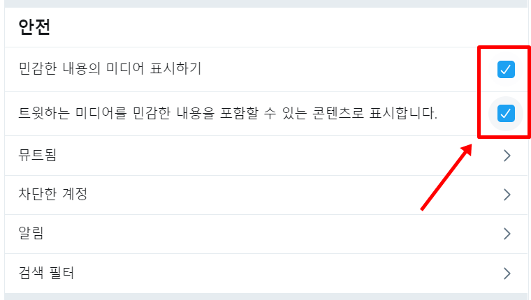 이제 아래로 쭈욱 내려보시면 안전부분에서 민감한 내용의 미디어 표시하기와 트윗하는 미디어를 민감한 내용을 포함할 수 있는 콘테츠로 표시합니다가 있습니다. 먼저 위의 표시가 다른 사람들이 올린 트위터 민감한 콘텐츠를 보여지게 만드는 설정이라고 할 수 있고요. 아래는 내가 앞으로 올리는 트윗을 민감하게 설정하여 숨기겠다는 의미입니다.