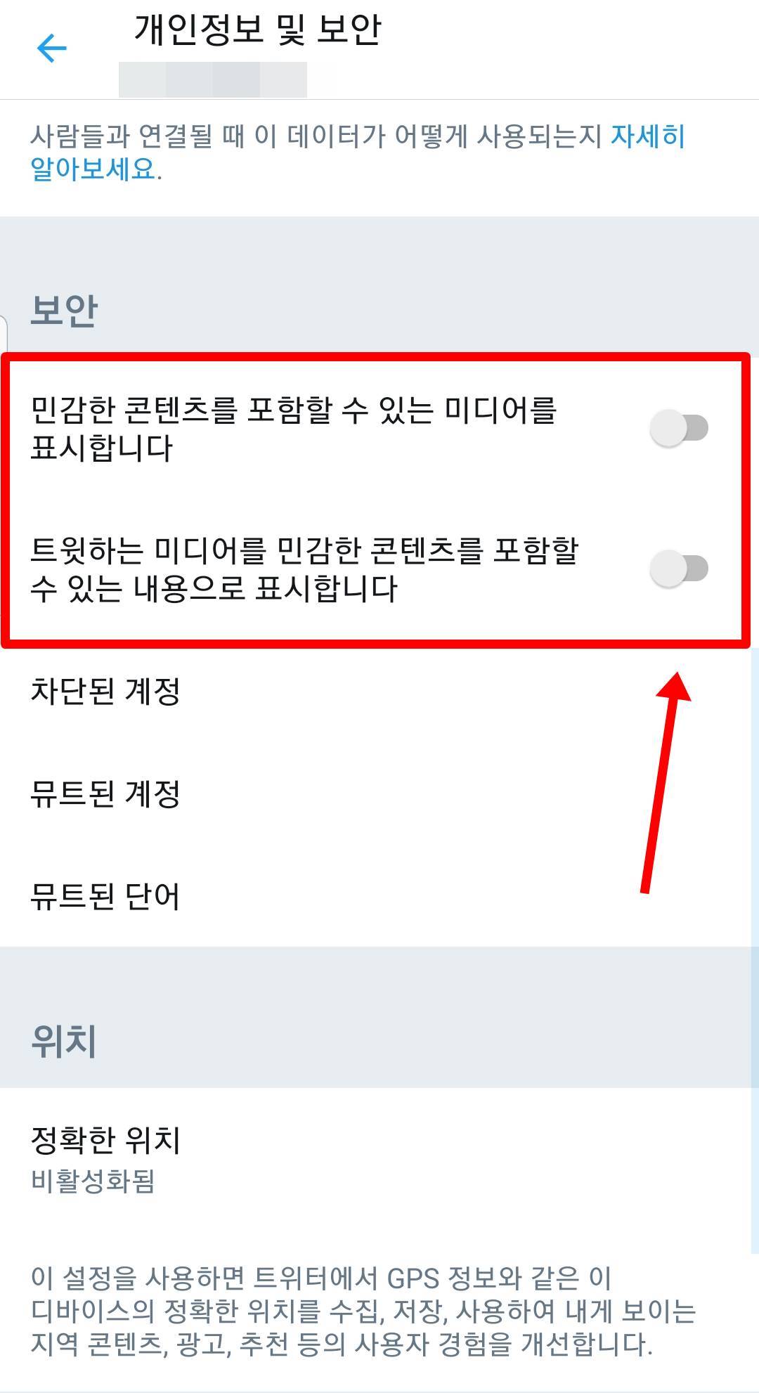 보안을 보시면 민감한 콘텐츠 포함 미디어 표시를 체크해주시면 됩니다.