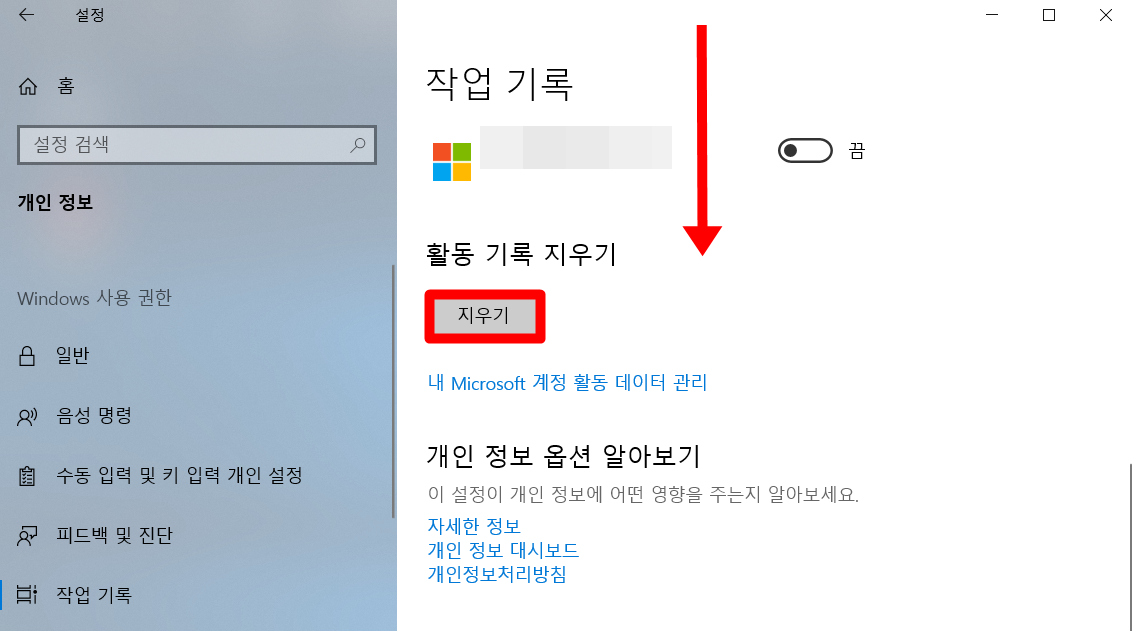 여기서 내 컴퓨터에 기록이 되는 것은 그렇다고 치더라도 마이크로소프트로 정보가 보내진다니 소름이 돋는군요. 무조건 해제 해주셔야 합니다. 여기서 체크만 풀어줬다고 해서 다시 작업보기를 들어가면 여전히 기록이 보이는데 아래로 내리셔서 기록을 모두 지우는 작업도 해주셔야 합니다.