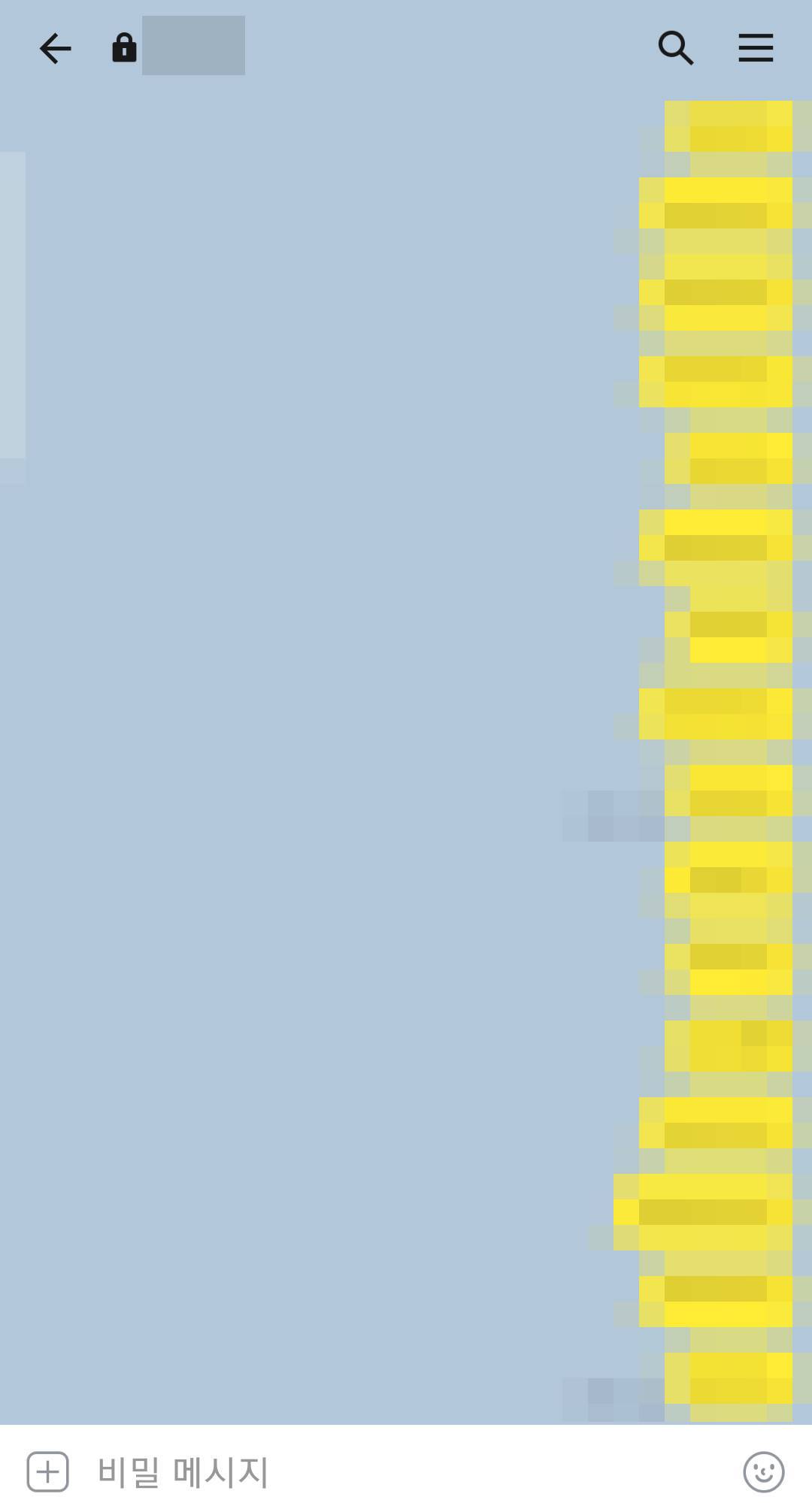 방을 나와보시면 미리보기 텍스트가 보여지지 않습니다. 만약 주변사람들에게 내 스마트폰이 보일 수 있는 상황에서 대비하지 못한 대화내용때문에 당황스러운 적이 한두번이 아니실텐데요. 카카오톡 비밀채팅에서는 이렇게 목록에서도 보여지지 않을뿐만 아니라 카톡 알림기능을 설정해두었다고 해도 팝업으로 알림이 전혀 오지 않게 됩니다. 또한 개인간의 대화를 국가에서 법적을 열람을 하는 경우가 있는데 비밀채팅에서 대화한 내용은 카카오톡 회사에서 절대로 알 수 없기 때문에 사회적으로 노출될 확률이 0%가 됩니다.
