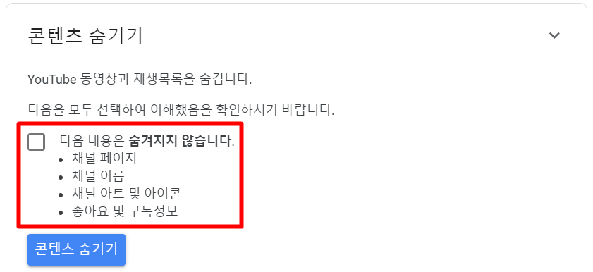 유튜브 콘텐츠 숨기기는 다음 내용을 제외한 모든 것이 숨겨집니다. 채널페이지, 채널 이름, 채널 아트 및 아이콘, 좋아요 및 구독정보 / 숨겨지는 내용은 동영상, 올린 모든 콘텐츠입니다.