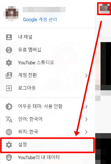 유튜브에서 로그인을 하면 우측 상단에 내 채널 프로필이 보일것입니다. 클릭해주시면 창이 하나 뜨게 되는데 이곳에서 설정을 찾아서 클릭해주세요.