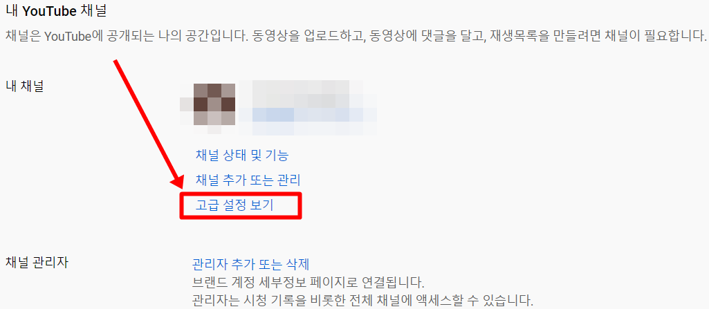 내 채널 - 고급 설정 보기 링크를 클릭해줍니다. 유튜브 채널 삭제와 숨기기를 지원하는 메뉴입니다.