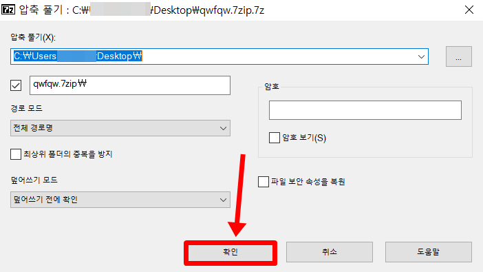 7zip 압축풀기가 된 파일을 받고 싶은 폴더 경로를 설정하고 확인을 누릅니다.