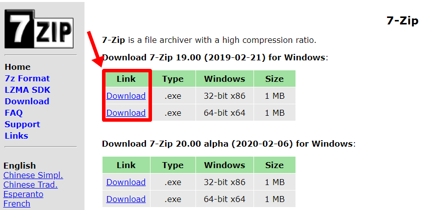 사이트에 들어가면 바로 7zip 압축풀기 프로그램을 다운로드 받을 수 있는 링크가 보입니다. 아래에 있는 것이 구버전이기 때문에 위에서 선택을 해주시면 되는데 현재 사용중인 컴퓨터의 비트수에 맞게 받아주시면 됩니다. 32비트와 64비트가 있는데 대다수 64비트체제로 사용하고 계실것입니다.
