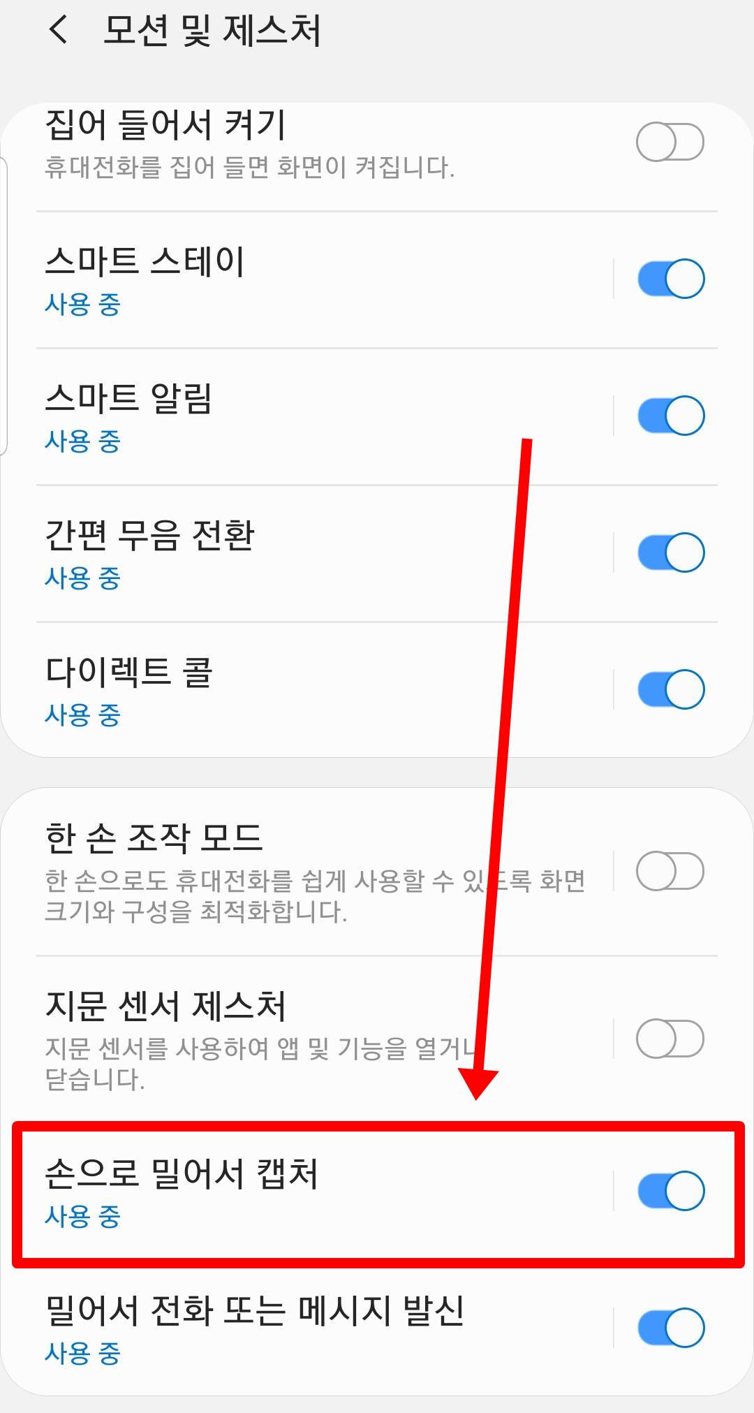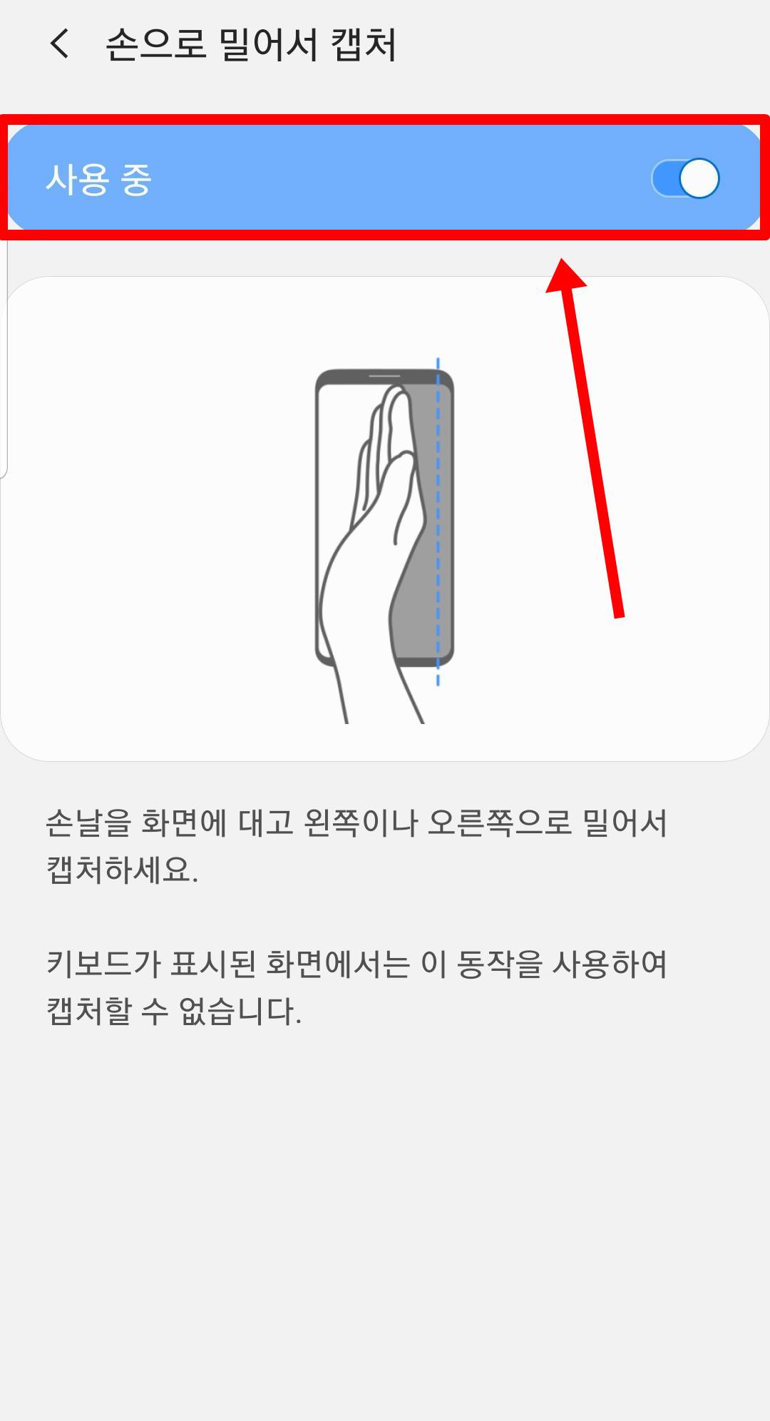 손으로 밀어서 캡쳐를 켜주시면(활성화) 하시면 됩니다. 사용 방법은 손날을 사진과 같이 화면에 대고 왼쪽이나 오른쪽으로 밀어서 쓸어주시면 캡쳐가 됩니다. 갤럭시 버튼이 고장나거나 이러한 손날 갤럭시 캡쳐 방법이 더 편리하다고 생각하시는 분들이 사용하는 분들이 많습니다.