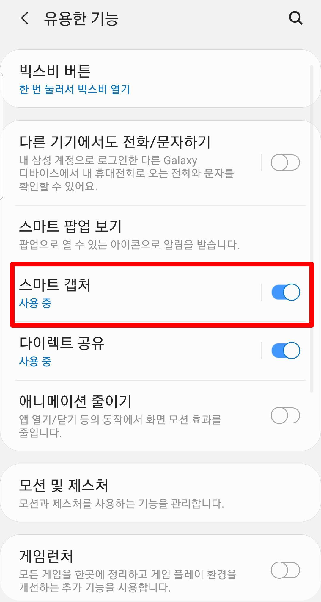 ▣ 설정 앱 - 유용한 기능 - 스마트 캡쳐 켜기 (활성화)