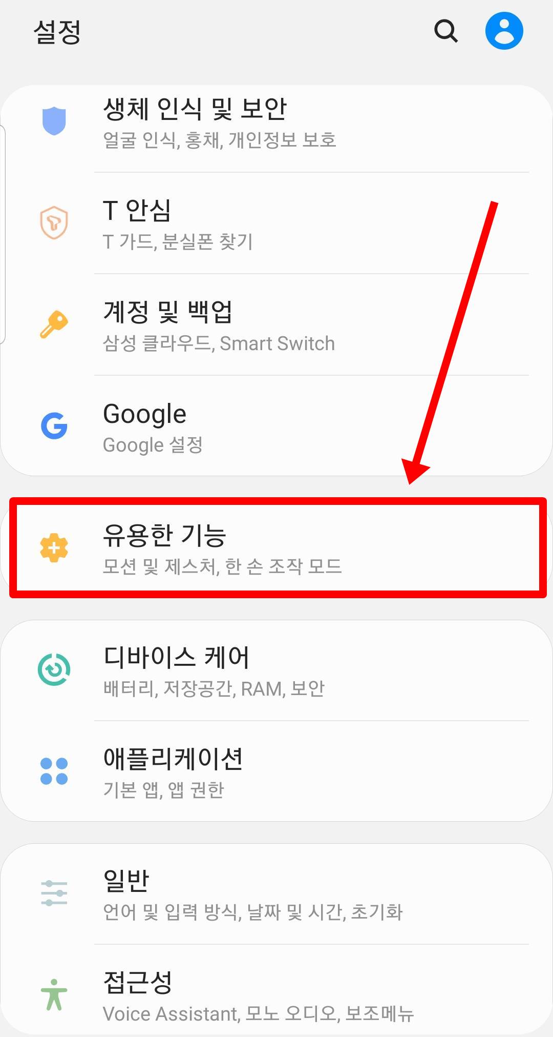 설정 어플리케이션으로 접속하셔서 유용한 기능 메뉴로 진입합니다. 그 후에 모션 및 제스처(모션과 제스처를 사용하는 기능을 관리합니다.) 메뉴를 클릭합니다.