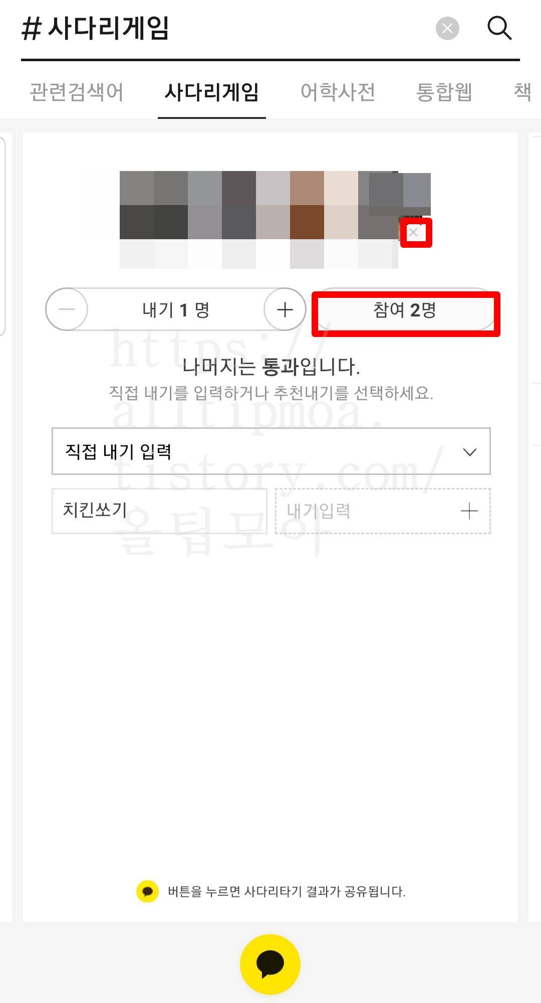 카카오톡 사다리게임 조작 방법은 간단합니다. 즉 내가 걸릴 확률을 줄이고 걸릴 상대방의 확률을 높게 만드는 방법이 있는데요. 바로 참가 인원수를 조절하여 해결할 수 있습니다. #검색 사다리게임을 검색하신 뒤 상단에 보이는 참가인원에서 벌칙을 받고 싶지 않은 나를 포함한 친구들을 프로필 좌측 하단에 있는 x를 눌러서 사다리게임 미참가로 만들어주시면 됩니다. 하지만 사다리게임의 특성상 참여인원은 2명이상이 되야하기 때문에 이점은 유의하셔야 합니다.