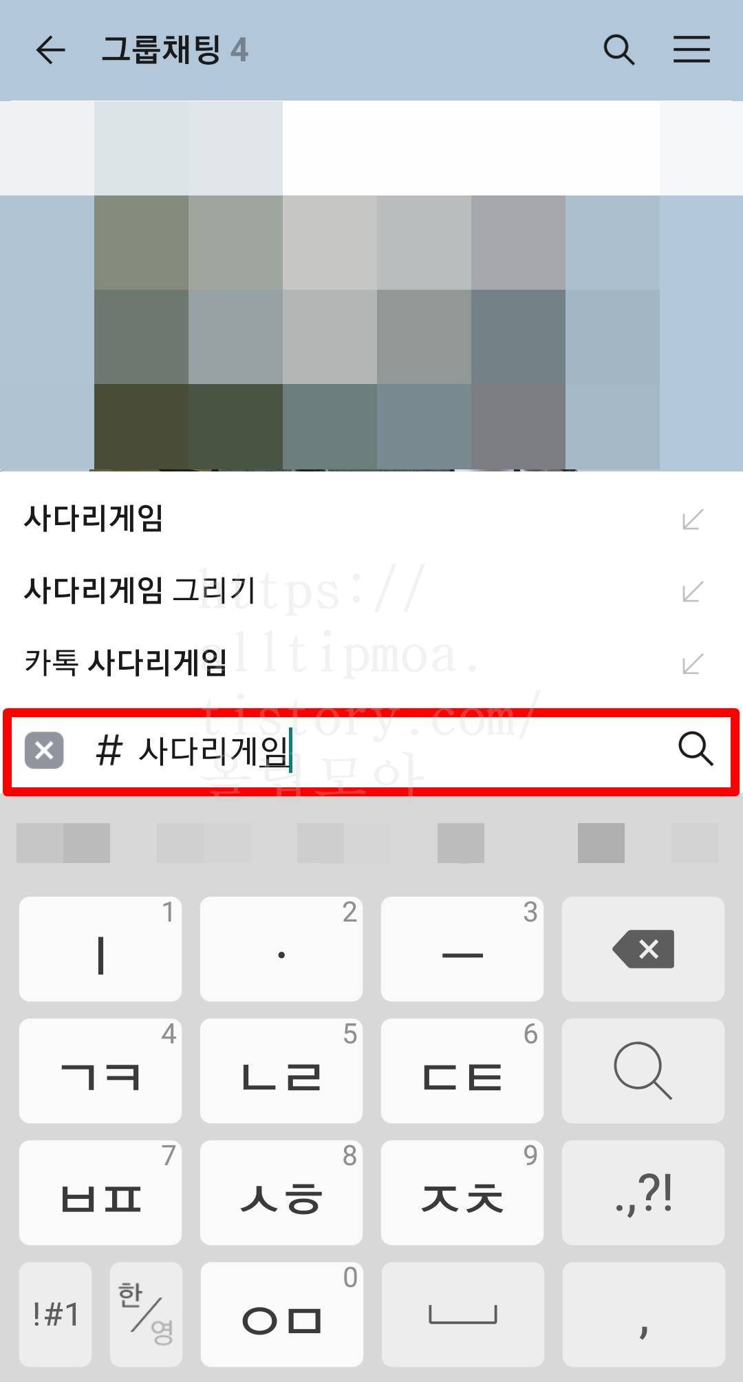 카카오톡 사다리게임을 하고 싶은 채팅방에 들어가신 후에 우측 하단에 있는 #을 클릭합니다. 그러면 검색창이 하나뜰텐데요. 이곳에서 사다리게임을 입력하고 검색 버튼을 눌러주시면 되겠습니다.