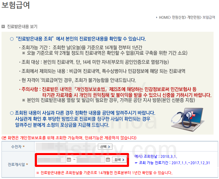 4. 수신자는 로그인된 본인의 이름이 보이게 됩니다. 이제 병원기록 조회로 확인하고 싶은 날짜, 기간을 설정해주시면 되는데요. 진료받은 내용은 조회한 현재 기준으로 14개월 진료분부터 1년간만 확인할 수 있습니다. 그렇기 때문에 너무 오래된 진료기록은 보이지 않습니다.