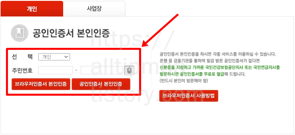 2. 개인의 병원기록 조회를 누구나 쉽게 해서는 큰 일이 나겠죠. 그래서 로그인시에는 공인인증서 본인인증이 필수입니다. 개인을 선택해주시고 주민번호 입력, 그 후에 공인인증서로 인증해주시면 됩니다.