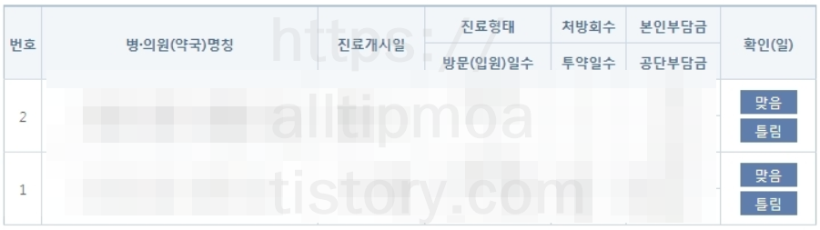 5. 바로 아래를 보시면 설정한 기간에 내가 진료받은 기록을 볼 수 있는데요. 병원, 의원, 약국의 명칭과 진료개시일, 진료형태, 처방횟수, 본인부담금, 방문일수, 투약일수, 공단부담금 조회가 가능합니다.